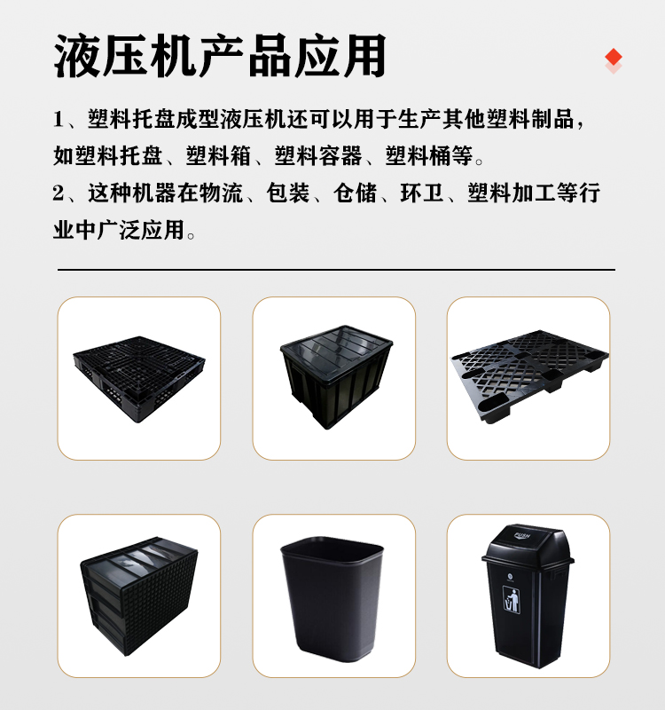 塑料托盤成型液壓機在物流、倉儲、包裝等行業(yè)中有著廣泛的應(yīng)用。塑料托盤是一種常用的物流包裝工具,可以用于存放、運輸和堆放貨物,提高物流效率,降低勞動強度。塑料托盤成型液壓機生產(chǎn)的塑料托盤具有質(zhì)量穩(wěn)定、耐用、環(huán)保等優(yōu)點,能夠滿足不同行業(yè)的需求。在電子、汽車、食品、化工等行業(yè)中,塑料托盤都是必不可少的物流包裝工具,因此塑料托盤成型液壓機在這些行業(yè)中具有重要的應(yīng)用價值。