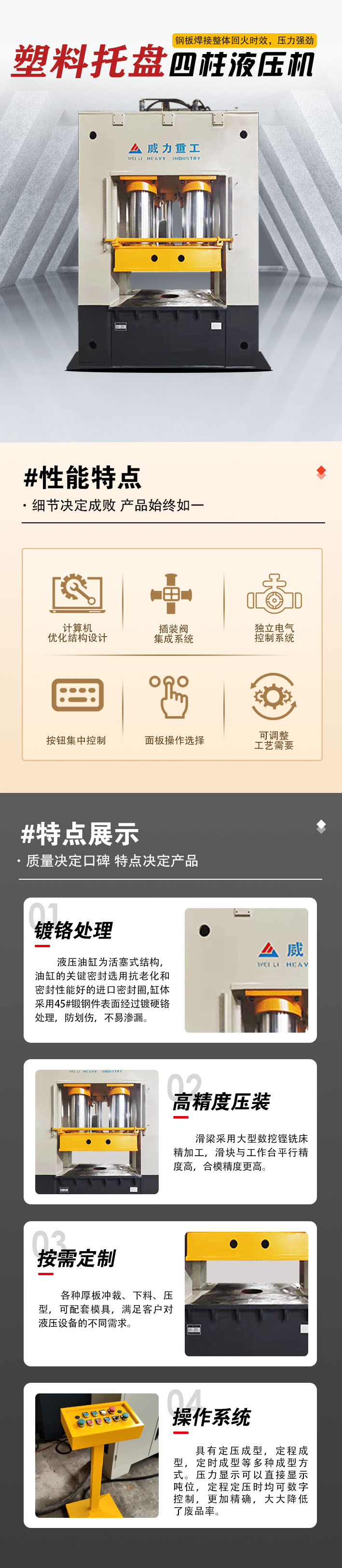 【產(chǎn)品描述】:塑料托盤成型液壓機是一種專門用于生產(chǎn)塑料托盤的設(shè)備。它采用液壓系統(tǒng),通過將熔化的塑料注入模具中,然后施加高壓力進(jìn)行成型,最終得到塑料托盤產(chǎn)品。這種機器具有高效、精準(zhǔn)、穩(wěn)定的特點,能夠生產(chǎn)出高質(zhì)量的塑料托盤。 塑料托盤成型液壓機在物流、倉儲、包裝等行業(yè)中有著廣泛的應(yīng)用。塑料托盤是一種常用的物流包裝工具,可以用于存放、運輸和堆放貨物,提高