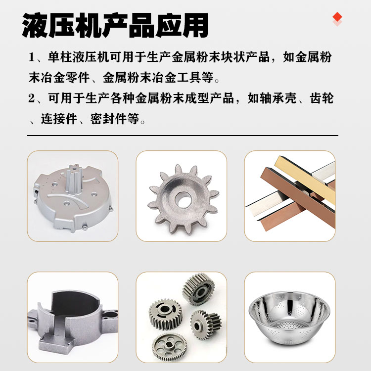 【產(chǎn)品描述】:單柱液壓機(jī)在冶金粉末成塊的應(yīng)用以及壓制產(chǎn)品方面具有重要作用。在金屬粉末冶金成型過程中,單柱液壓機(jī)通常用于將金屬粉末壓制成塊狀、片狀或其他形狀的工件。